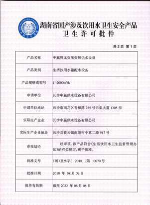 • 無負壓變頻供水衛生許可證2